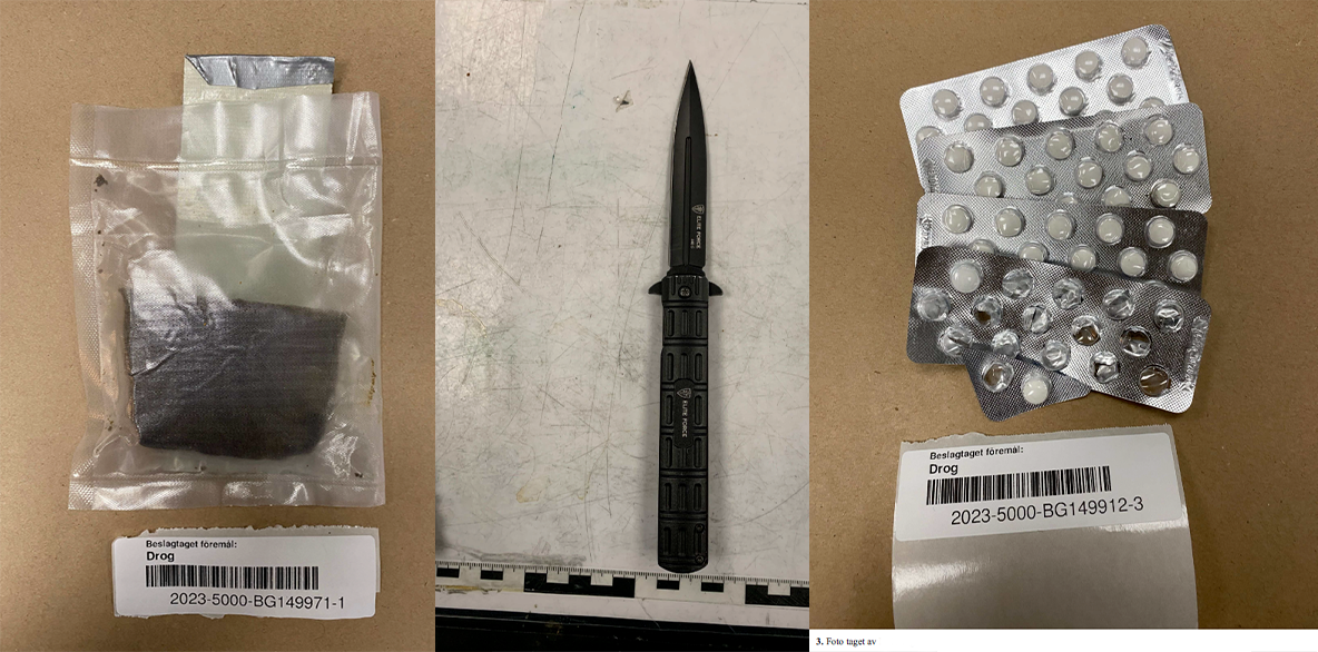 Efter detta genomfördes en husrannsakan i mannens bostad. Där hittade polisen mer narkotika samt en kniv som var fasttejpad på väggen. Den uppskattade mängden narkotika enligt åtalet uppgår till närmare 600 tabletter samt 57,9 gram cannabis, packat i portionspåsar. Enligt åklagaren tyder mängden narkotika och det faktum att cannabiset var uppdelat i portionspåsar på att preparaten varit avsedda för försäljning.