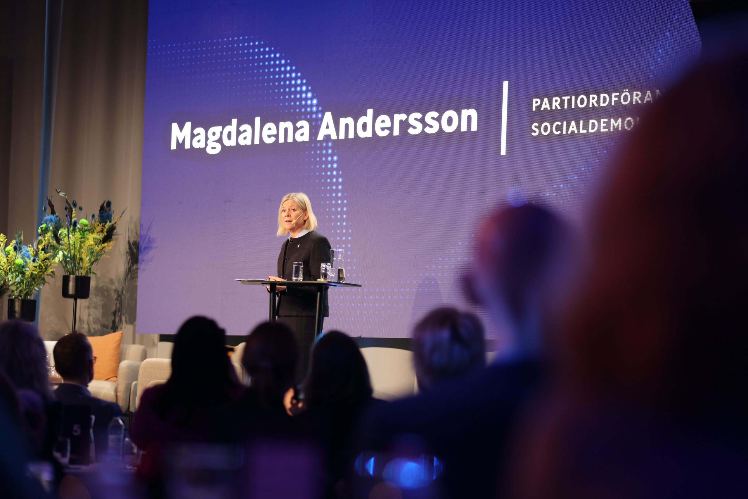 Senare var det Magdalena Anderssons tur att tala. Hon talade om samarbete mellan politik och näringsliv. Hon lyfte också det som hon tidigare tagit upp i andra sammanhang: att hon gärna vill se en blocköverskridande energiöverenskommelse. Hon upprepade också vikten av att göra sig av med beroendet från “diktaturernas olja”. Andersson vill inte heller låta den svenska politiken amerikaniseras genom ökad polarisering.