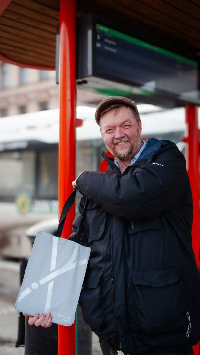 Lars-Åke försvinner ett tag och kommer sedan tillbaka med en reflexväska – årets present från bussbolaget.