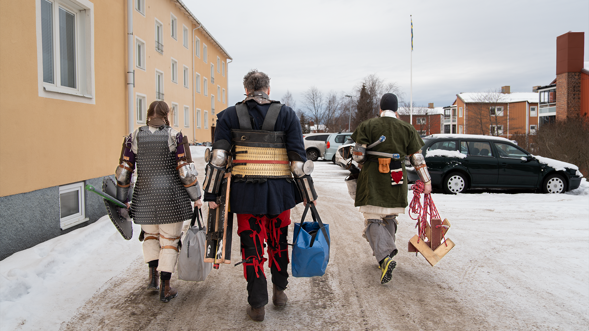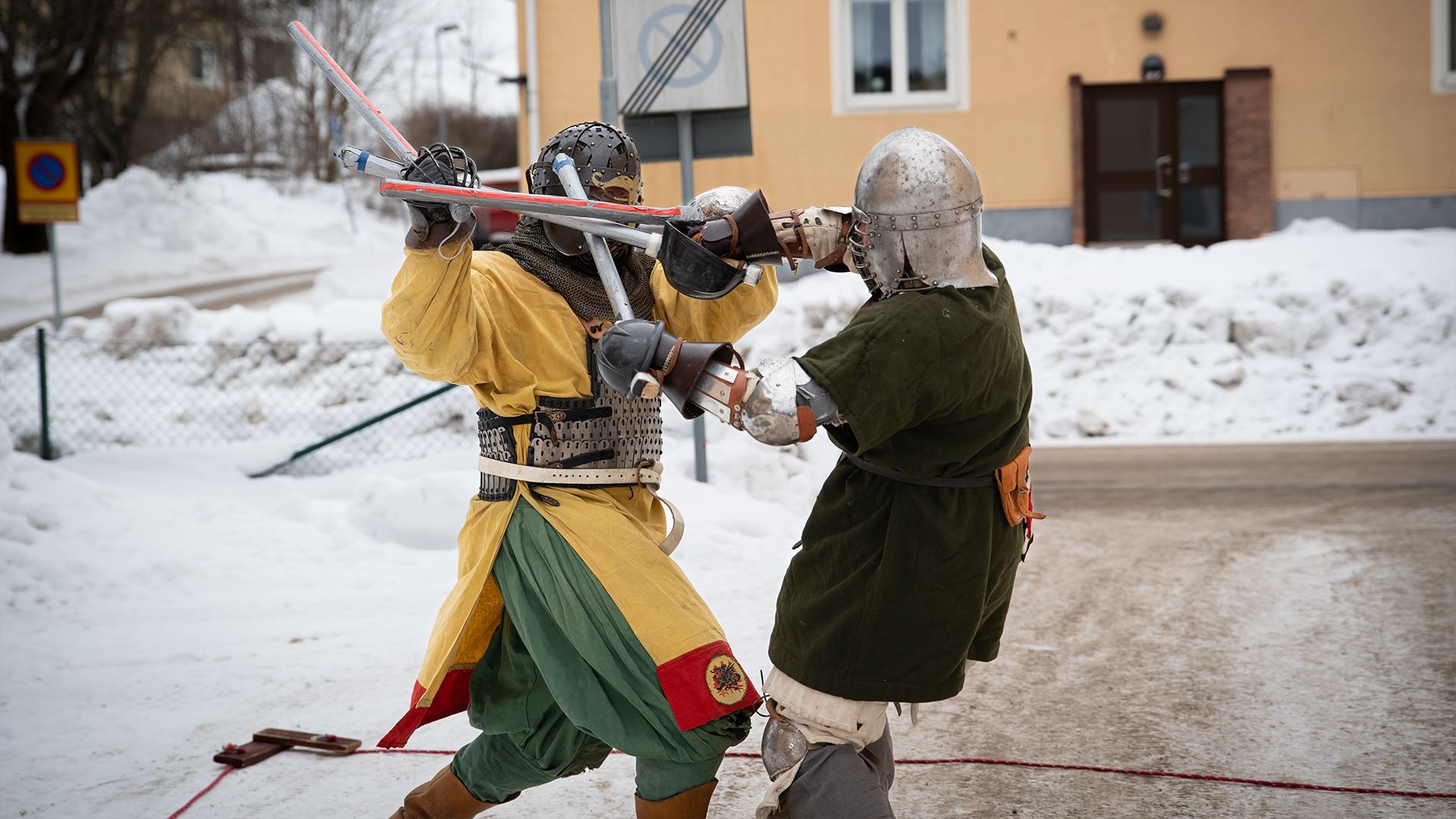 På den grusade planen utkämpas varje lördag en kamp till döden, eller i alla fall en simulerad död. Rustningarna blänker i vårljuset när svärden i rotting svingas febrilt. Målet är att besegra motståndaren utan att själv bli träffad. De fyra kämparna roterar mellan varandra för att alla ska få mötas. Ringbrynjan, vapentröjan och hjälmen gör att det kalla vädret uppskattas när de slåss.