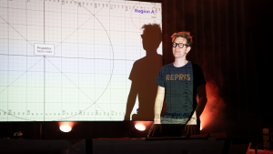 Senare på kvällen ska publiken möta en av landets mest välkända komiker. Men på eftermiddagen rör han sig mer som en tekniker än som en stjärna: mellan skyltar, ljus och siktlinjer, upptagen av sådant som helst inte ska märkas när föreställningen väl börjar.