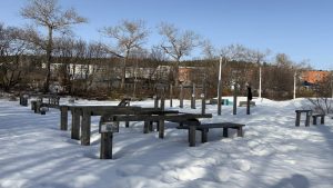 Hillstamons utegym vid södra berget, utrustad med elva träningsstationer i trä. Foto: Sundsvalls kommun.