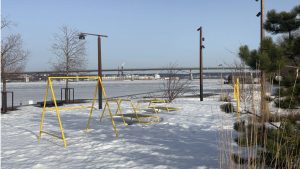Utegym precis vid vatten med redskap för kroppsövningar vid Rosenborgskajen. Foto: Kevin Wikström.