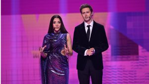 Gina Dirawi är en av programledare över melodifestivalen med Hampus Nessvold. Foto: Stina Stjernkvist, SVT.